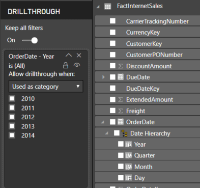 On the Order Details page, drag the Year value from Order Date in FactInternetSales to the Drillthrough filter area as shown in Figure 2. This will be our link to the main page to allow us to drillthrough based on the year of the order date. So when we are viewing Sales by Year on our main chart, we can choose to drillthrough and see all of the individual order that made up that year.