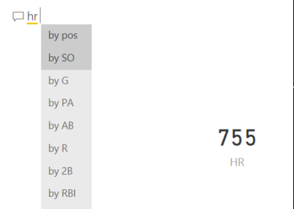 In essence, Q&A provides answers in the form of charts and graphs to natural language questions in real-time type-ahead fashion. Watch the progression in Figures 2 through 5 as we type ‘hr by year’ as our question. Also, notice that typing HR first gives us a 755 HR total in the chart responding to our request. Remember that our dataset is called Standard Batting so you can see that Figure 2 shows us the HR column of that dataset as a selection. This is useful if the column was found in multiple locations.