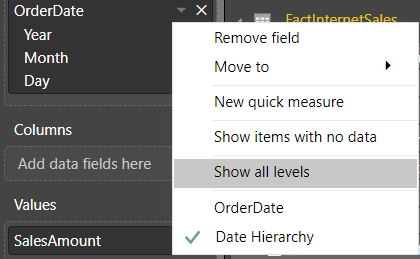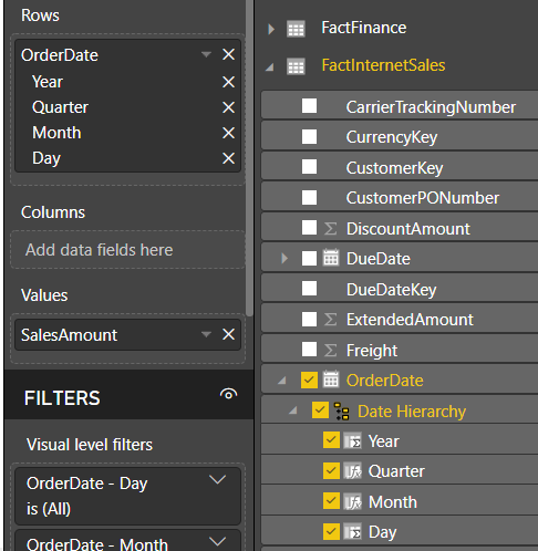 To recap quickly, we were using the AdventureWorksDW2014 data warehouse and we added SalesAmount and OrderDate from the FactInternetSales table. We want to insert a matrix table onto the report as those work with the drill down feature whereas the regular table visualization does not.