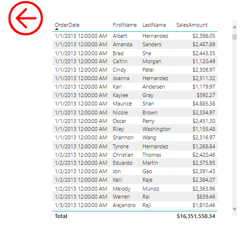 Let’s create a second report page and name it Order Details. On this page, add Order Date (as a date and not a hierarchy) and Sales Amount from FactInternetSales and FirstName and LastName from DimCustomer. This will give us some basic order details as shown in Figure 1.