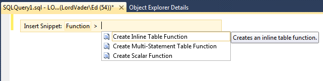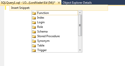 This looks great but there is no insert button to put these snippets into my code, I tried. So how do I enter the code into the query editor as I type? Hold the control button (CTRL) and then press the K and then X to begin the insert, and yes I know this is an awkward key combination (what where they thinking). See figure 2 and choose a category of snippets.