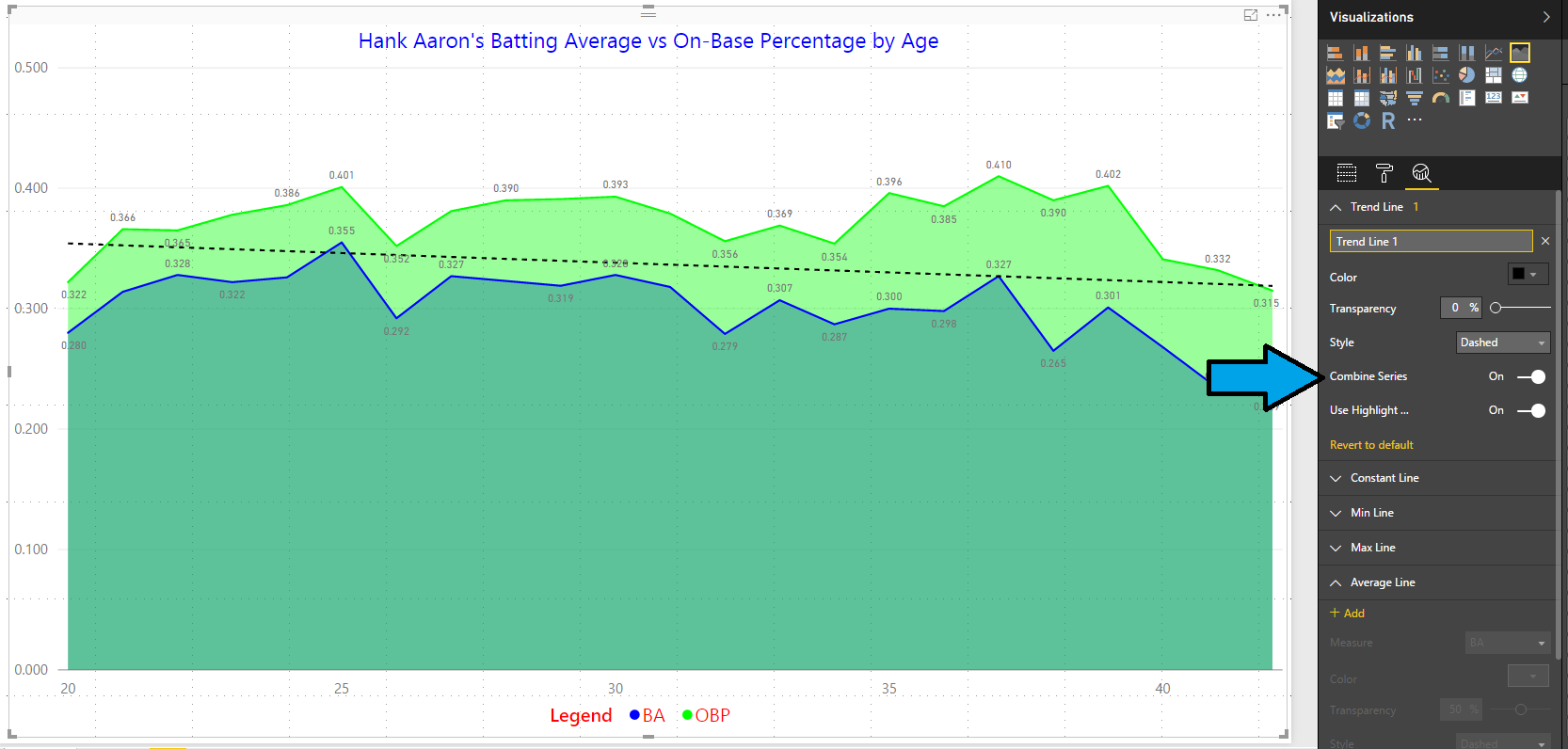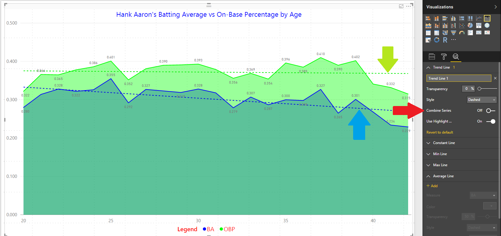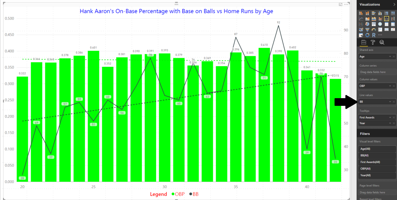 Now remove the batting average (BA) field from the Column values to avoid confusion as we want to see if walks (BB) correlate with on-base percentages (OB) and home runs (HR) for Hank Aaron. First off, let’s change the title to something a little more reflective of our comparison. Then, add the BB field to the Line values as depicted by the black arrow in Figure 2. Also, notice that a trend line was added for these in a dashed version of the color used to depict the walk line.