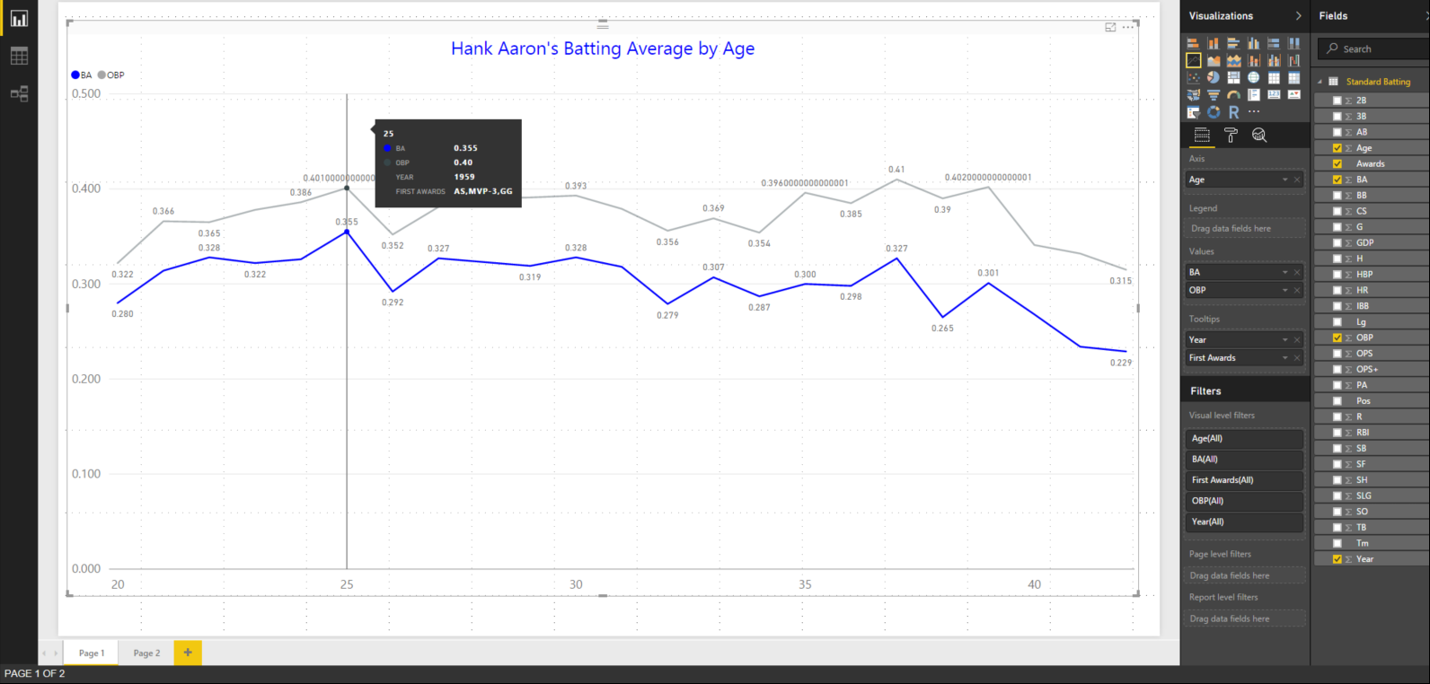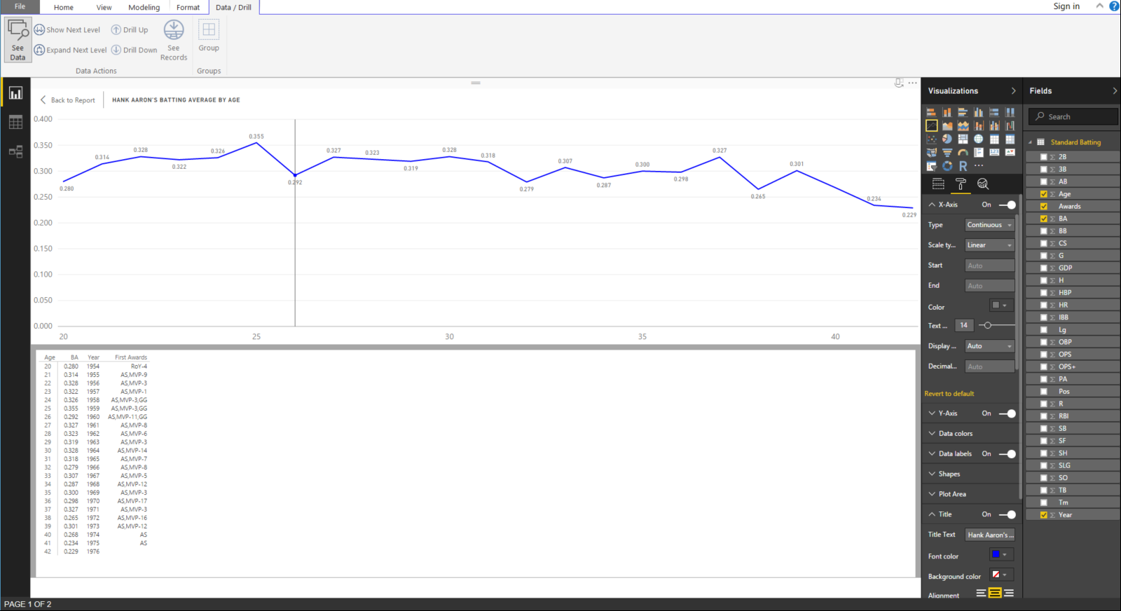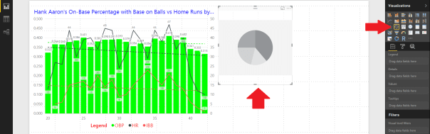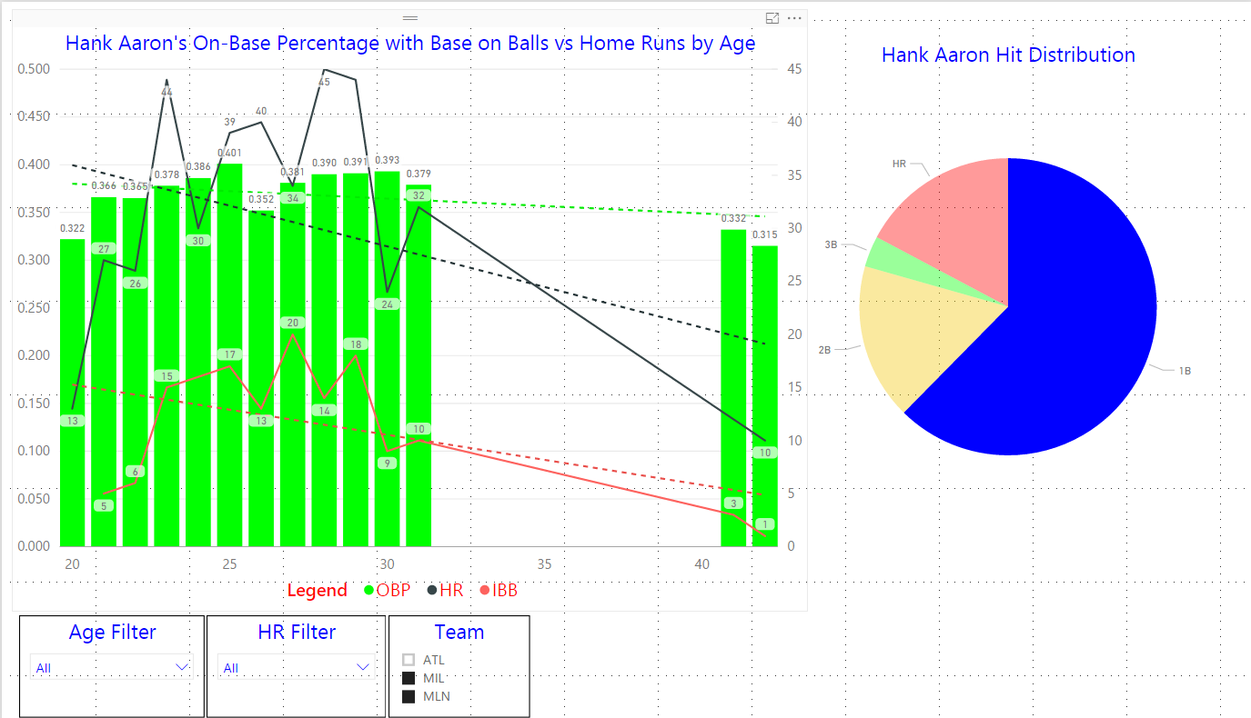 Yesterday we made an assertion about Hank Aaron’s on-base percentage (OBP) remaining fairly flat over his career that could have been caused by more walks as a result of him being a home run hitter. This is a common strategy in baseball where the pitcher will walk a home run hitter to prevent a home run when there are runners on base. We should test that theory using our data! Change your visual to the Line and clustered column chart in the Visualizations pane. Your visual should appear like Figure 1.