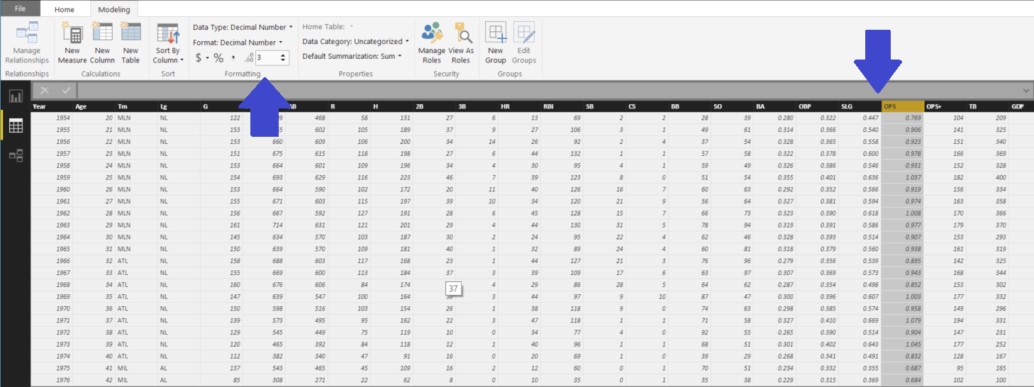 Did you see it? The data labels are showing some crazy decimal places. Let’s tidy that up too! Go back into the dataset and change the formatting from Auto to three decimal places for OBP as shown in Figure 4. We should go ahead and do the same for SLG and OPS while we are in there in case we want to graph them later. We did this in day five for batting average.