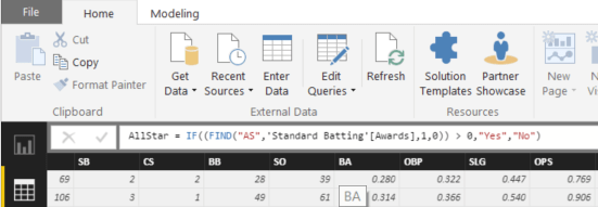 - Repeat steps two and three: GoldenGlove = IF(FIND(“GG”,’Standard Batting'[Awards],1,0) > 0,”Yes”,”No”)