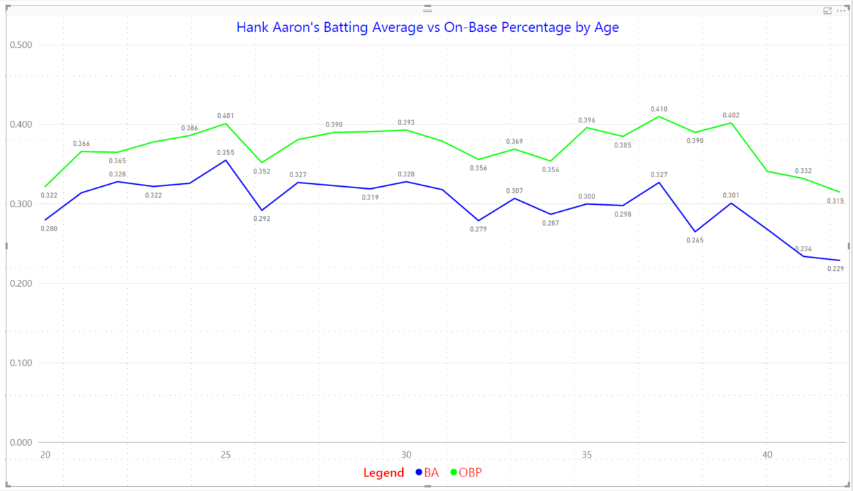 Let’s make some formatting changes to clean up our addition. First, let’s change the title to reflect our added data as sown in Figure 3 with the blue arrow. Now, we can change the OBP line to green as shown with the green arrow so that in stands out in comparison to the blue of the BA. Now let’s add a legend, place it in the bottom center, increase the font size, and color it red as shown with the red arrow. We are fast becoming pros at Power BI. Did we miss anything? Take a good look.