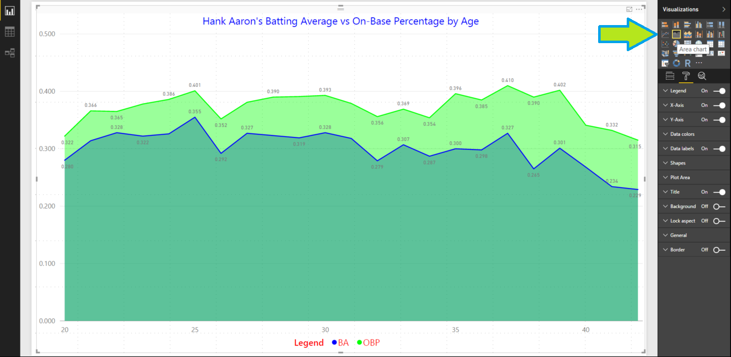 Speaking of trend lines, let’s add some simple analytics such as a Min and Max line. We can easily add a Min line for the BA and the OBP. Select the third icon in the pane below the Visualizations called Analytics as shown in Figure 3 with the red arrow. Select Min Line and add two Min Lines and configure them as shown with the blue arrows. We need the colors and alignment to show in our area chart. For batting average, I used a bright yellow line and for on-base percentage a red. I then used a black font and moved it to the right and under the line. If the colors are hard to see you could switch back to a regular line chart to prevent the color clash.