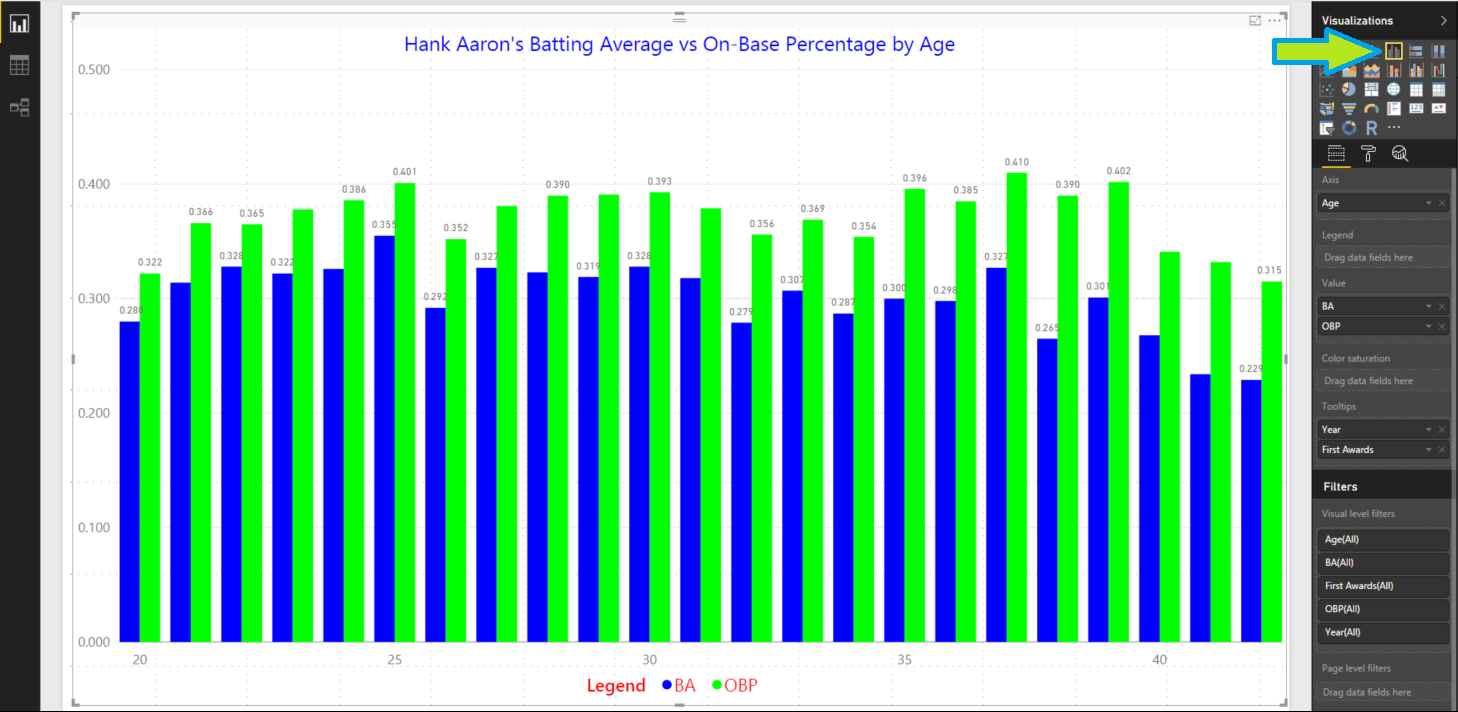 Try some other visuals. Better yet, try them all. Personally, I do not think any of the other visuals work with this set of selected values. For example, in Figure 2 we see a Clustered Column Chart which to me isn’t as easy to see the natural trend line but it works. I think the original Area Chart works best in this scenario. Let’s switch back to that visual moving forward.