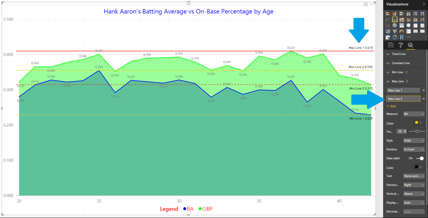 Now we can do the same to add in some Max Lines using straight lines with the same respective color for either OBP or BA as showing in Figure 4. I changed these to be solid lines to avoid confusion. The visual is sort of busy but it works, right? Maybe the color choices are not perfect and those can always be tweaked. But we’ve added some base analytics to our visual. We are rock stars, right? Stay tuned for more.