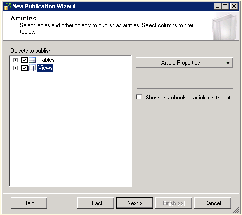 Then we will select the articles or tables and views that we wish to replicate. Here, I have selected all tables and views in Figure 3, but you can drill down and select only certain ones if you prefer. The next screen indicates if there are any issues and how to correct them.